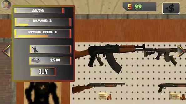 4、会显示各种武器,通过最左边和右边的箭头来切换武器,每种武器我们可以看到名称、伤害、攻击速度,子弹,价格,比如说AK74需要2500美金;