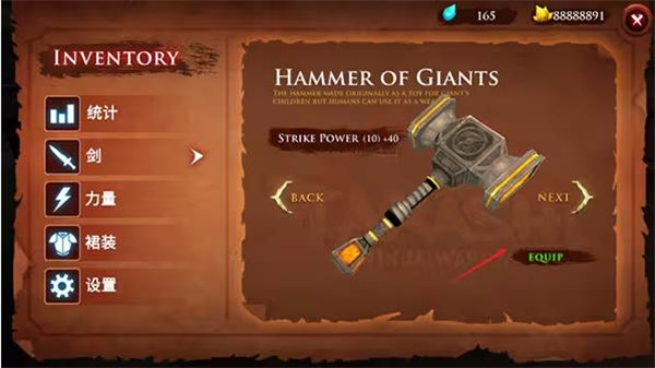 3、这里提供了剑、力量和裙装饰品的详细说明,点击EQUIP即可更换新的武器和裙装;