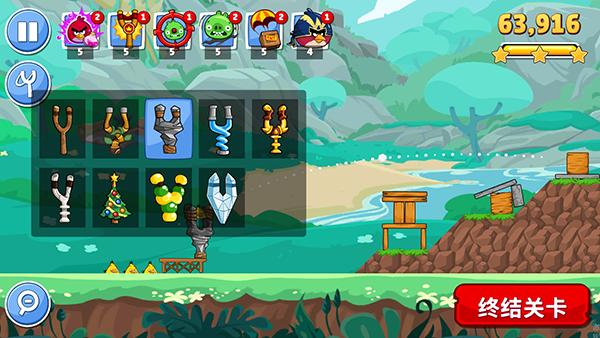 3、在游戏正式开始后,你需要拉扯弹弓,把拥有不同技能的小鸟发射出去,击败所有的猪头即可获取关卡分数;
