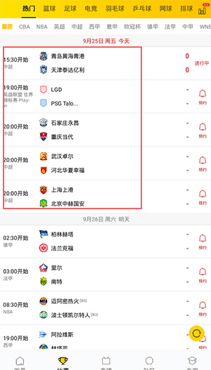 3、点开比赛,有篮球、足球、电竞、羽毛球等多种体育的比赛时间,用户还可以预约,比赛快开始的时候还会通知到你;