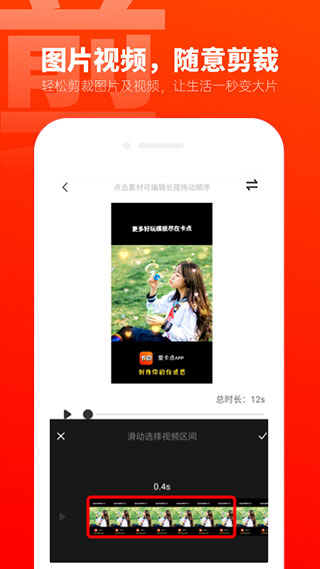 同时支持视频&照片素材,导入视频时,还能快捷选择想要出现的片段。