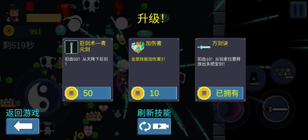 游戏采用休闲像素风格,搭配随机技能组合,挑战来袭的怪物,在地图上尽情斩杀通关,获得更多奖励。