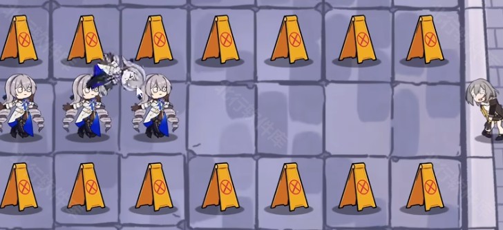 第六列牌子放两个帕姆,最开始出来的开拓者在哪条路就空着哪条路,然后在从左往右第一列牌子那放鸭鸭,就放僵尸那一列,一般开拓者离最近的植物有三四格的距离就不用放第二个鸭鸭,开头的开拓者解决了就可以放上帕姆了;