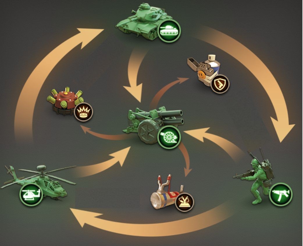 战斗系统是策略游戏的核心,如你所见,兵人大战中设定了四种类型的士兵,他们分别是装甲车、突击兵、直升机、火炮。不同的兵种在属性上存在着差异,同时会出现兵种互相克制的情况。了解兵种克制关系有助于在战斗前考虑出战队伍。