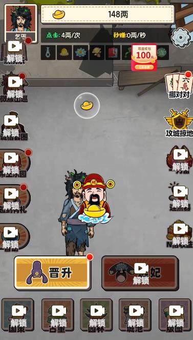 钱袋子保卫战,一款以明朝为背景的逆袭之旅 小游戏 ,玩家扮演朱重八,从一个小乞丐开始,通过疯狂点击赚取元宝,逐步教育臣民、选妃,最终逆袭成为皇上。
