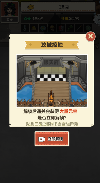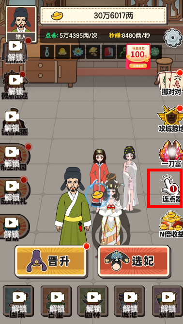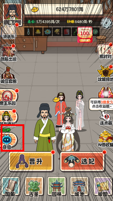 解锁左边的自动,一起点击自动和连点器让你的元宝收益飞速增涨