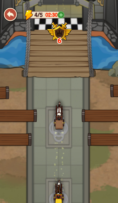 2、控制下面的马车,在两边木槌的缝隙当中安全通过,注意马车不能被木槌碰上