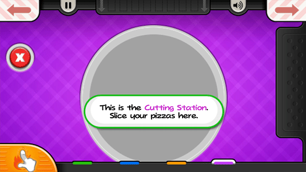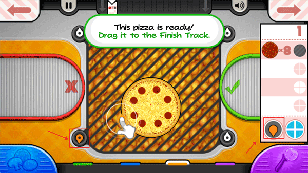 9、烤披萨的时候记得注意火候,当左下角的“火”变成橙色时,就可以将披萨拖至切割站进行切割了;
