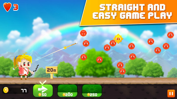《像素射手王》是一款射击游戏。在游戏中,玩家需要利用弓箭来清除道路上的敌人。每次发射都会使角色前进一步,当敌人接近到一定距离时会开始攻击玩家。因此,玩家必须精确瞄准,积累一定数量的金币后可以使用特殊的弓箭。